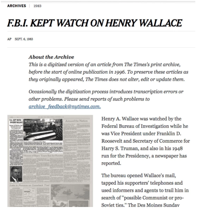 That the FBI conducted an extensive counterintelligence investigation of Wallace was unknown until 1983 – eighteen years after his death. Citing reporting by the Des Moines Register, the New York Times explained that “Wallace was watched by the Federal Bureau of Investigation while he was Vice President under Franklin D. Roosevelt and Secretary of Commerce for Harry S. Truman, and also in his 1948 run for the Presidency” and that “the bureau opened Wallace’s mail, tapped his supporters’ telephones and used informers and agents to trail him in search of ”possible Communist or pro-Soviet ties.’”